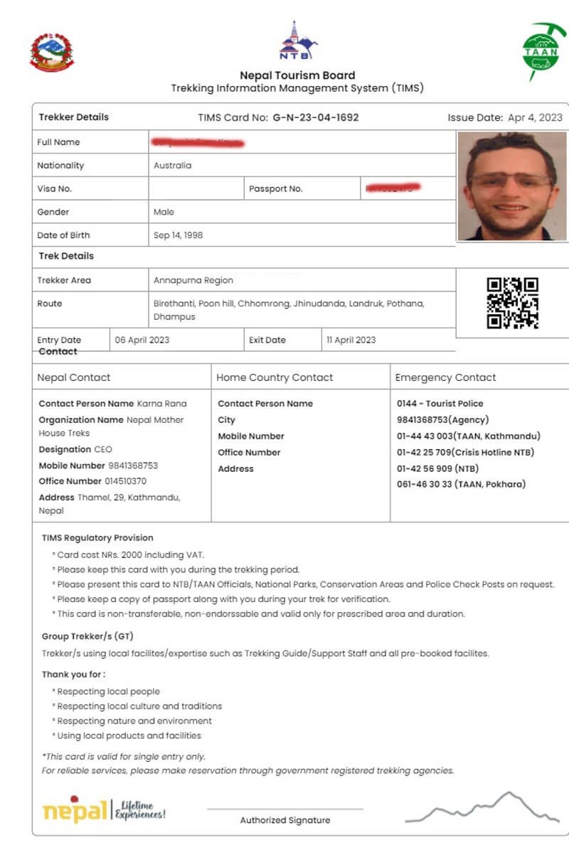 - The trekker must provide a copy of their passport and a valid visa for the entire trek.