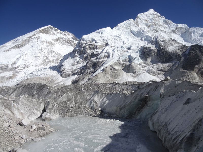 Khumbu Glacier is the highest glacier in the world. It is located at the base of Mt. Everest and the ridges of Nuptse and Lhotse. It is just below the Khumbu Icefall.